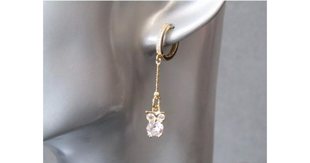 18k Gold Owl Dangle Earrings: Cubic Zirconia Huggie Hoops