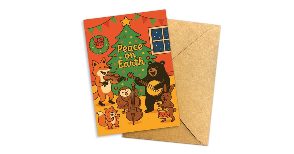 Peace on Earth Christmas Card, Cute Woodland Animal Holiday Greeting, Adorable Fox, Bear, Owl, and B