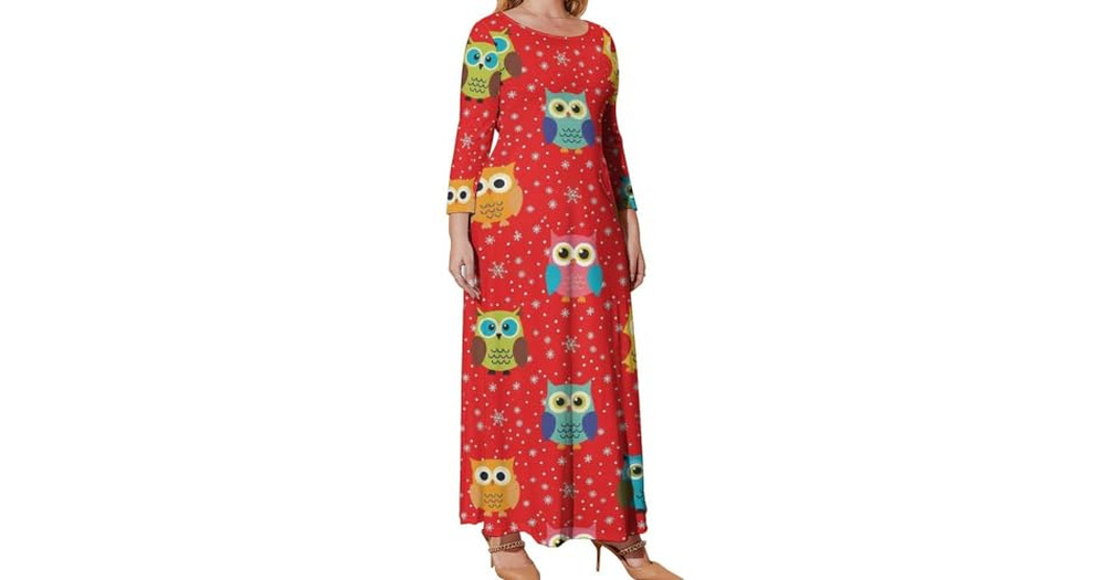 Owl Red Dresses for Women Casual Long Sleeve Maxi Dress for Office, Prom, Vacation, Travel
