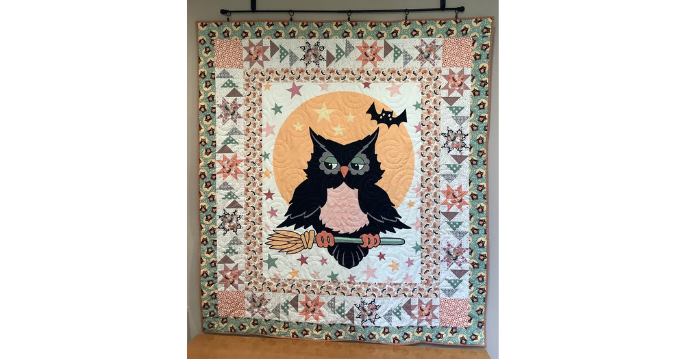 Custom Halloween Whimsy Owl Quilt Completed Finished Handmade Quilted Blanket Bats Stars Broomstick