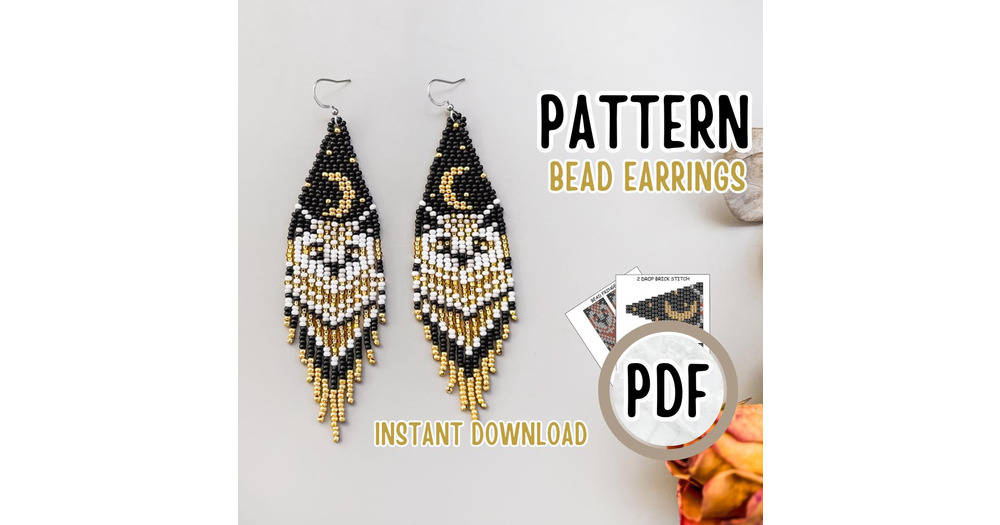 PDF Bead boho gold owl moon Fringe Beading Earrings, gold moon night beaded Earrings Pattern, Earrin
