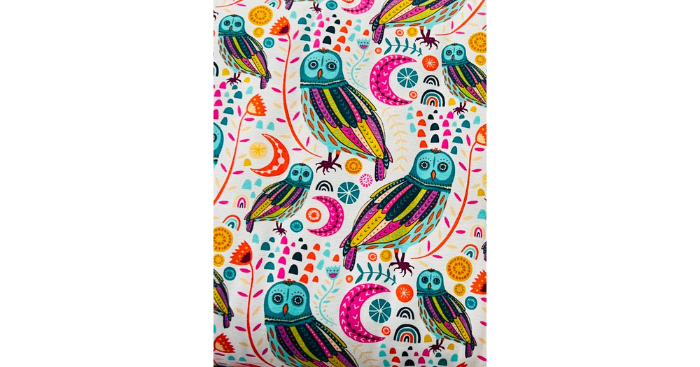 Owls, Moons on White KNIT Cotton Fabric- "Sova Sunshine"