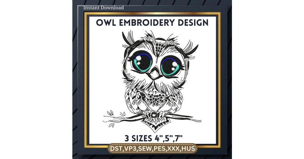 Elegant Mystic Owl Embroidery Design, Monochrome Wisdom Emblem for Dark Fabrics, Night Forest Bird,
