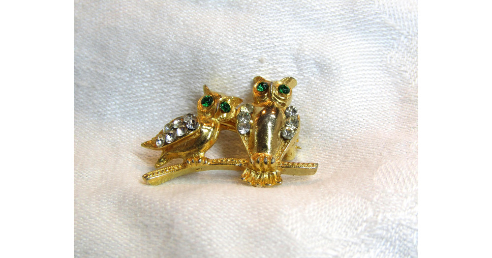 Vintage Small Duo of Gold Finish Owls on Branch with Clear Rhinestones Brooch