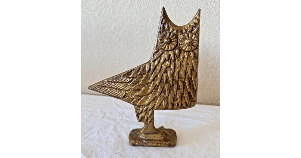 Mid Century Horned Owl Sculpture Modernist Figurine Gold Metal Statue Art MCM