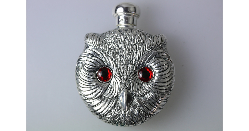 Owl Bird Art Deco Style Silver Perfume Scent Bottle Continental Silver Red eyes