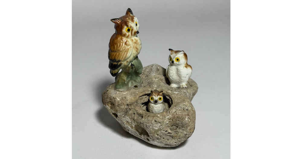 Vintage 70s Ceramic Owl Figurines on Stone: Owl Rock Art