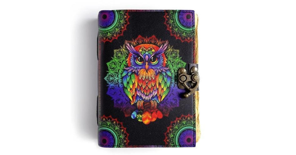 Al-Amir Handmade Owl Mandala Printed Leather Journal with Vintage Lock and Deckle Edge Paper