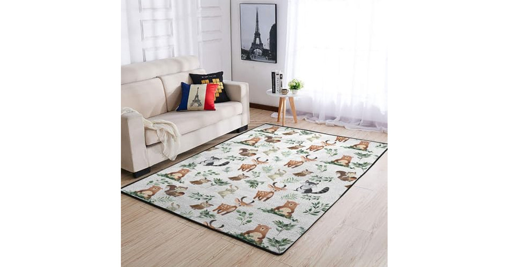 Baby Animals Green Leaves Area Rugs Bear Deer Owl Bunny Raccoon Squirrel Boho Leaves Throw Mat Floor