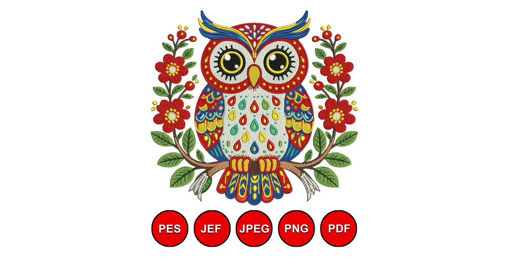 Colorful Owl Embroidery Design | Folk Art Owl Machine Embroidery Pattern | Floral Owl Embroidery Art