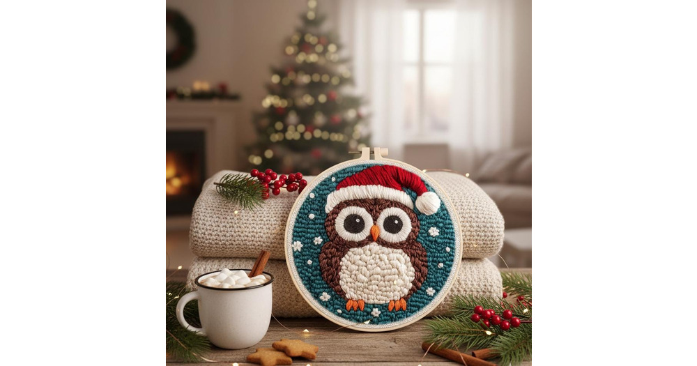 Christmas Owl Punch Needle Kit – Beginner DIY Embroidery Starter Set, Animal Pattern
