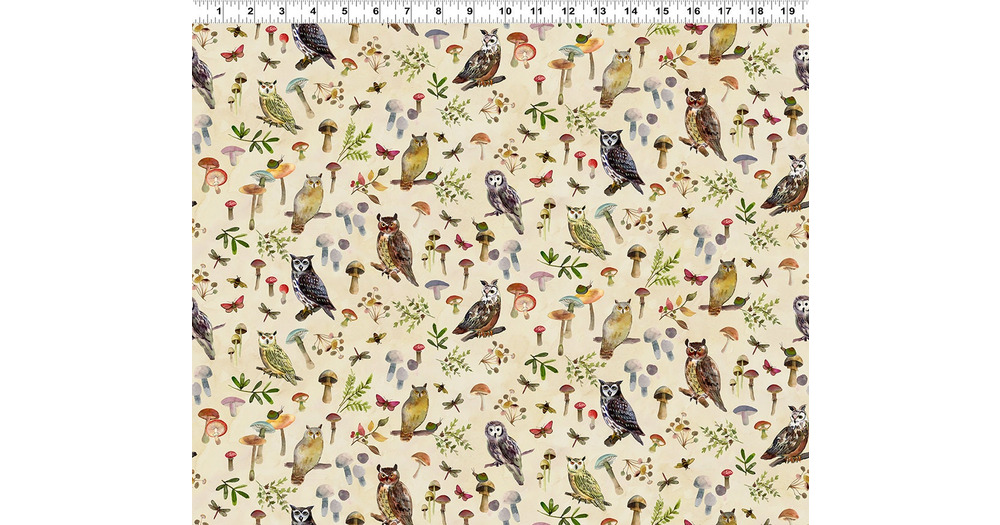 Wild Wonder by Clothworks Digital Owls and Mushrooms Light butter sold by the 1/2 yard #Y4075-58 lig