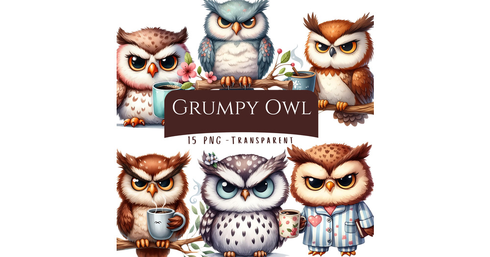 Grumpy Owl Clipart Bundle 15 PNG High Quality Cute Quirky Morning Owl Digital Download Printable Pap