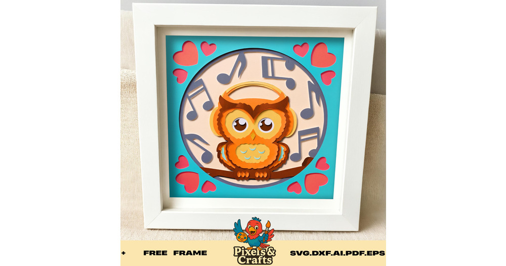 Owl Music SVG Layered Paper Art File for Cricut and Glowforge, Cute Owl with Headphones 3D Shadow Bo