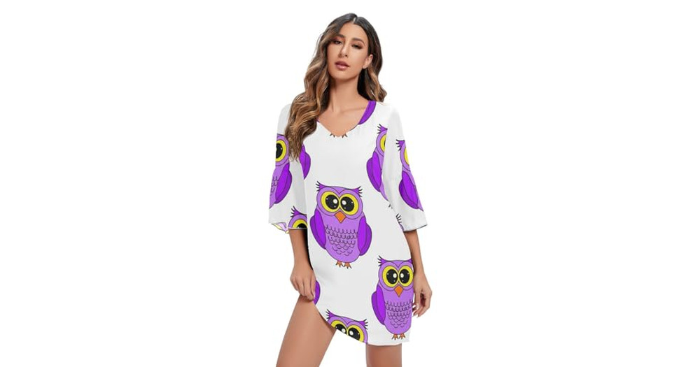 RPLIFE Cute Purple Owls Summer Dress 3/4 Sleeve Hawaiian Print Dress Women