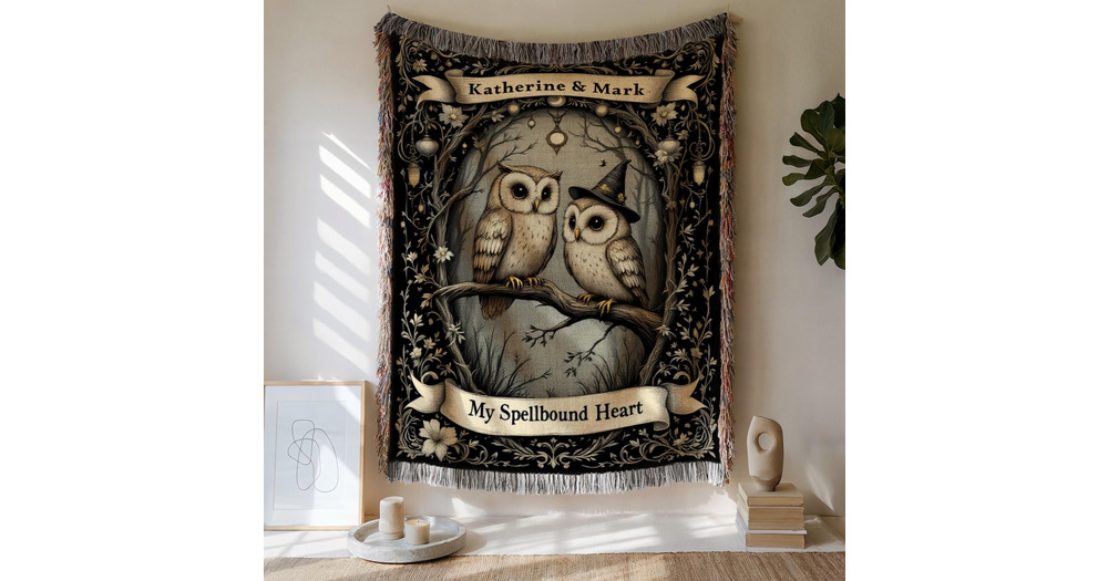 Woven Owl Couple Blanket: Personalized Cotton Tapestry with Fringe