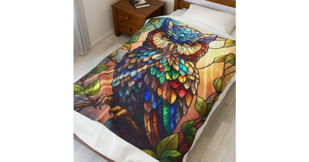 Colorful Stained Glass Owl Velveteen Plush Blanket | Boho Nature Throw
