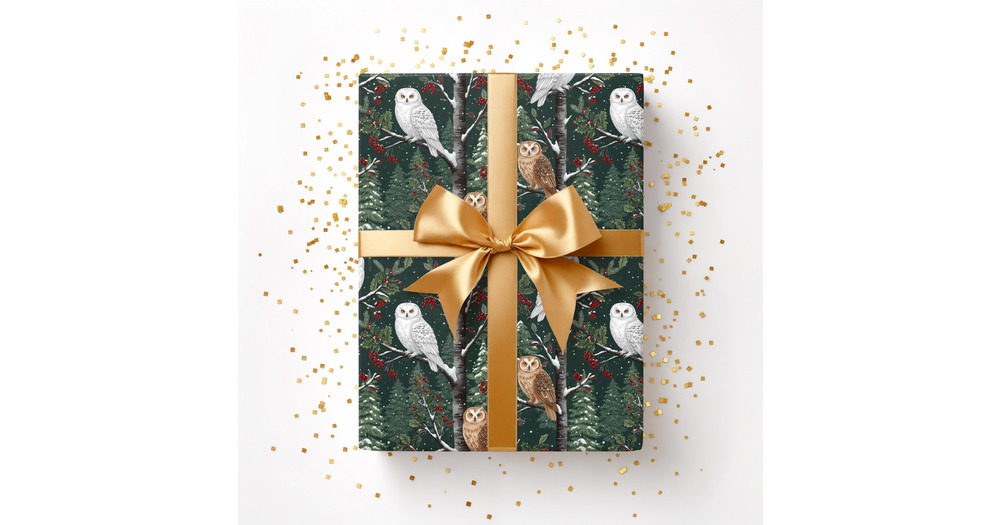 Christmas Owl Gift Wrap, Snowy & Tawny Owl Wrapping Paper, Winter Forest, Birch Pine Trees