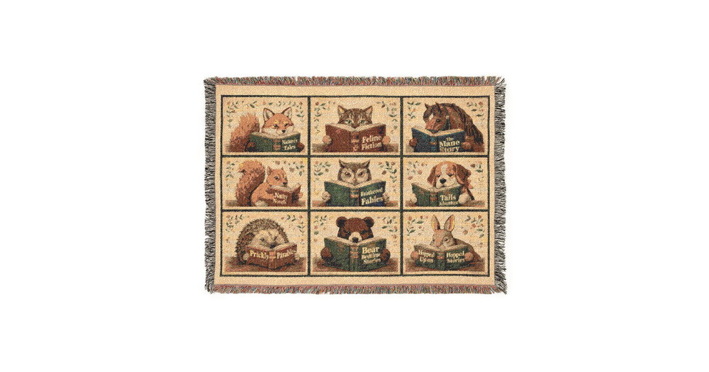 Reading Cats Dogs Horse Bear Rabbit Fox Owl Woven Blanket | Cat Library Tapestry Throw