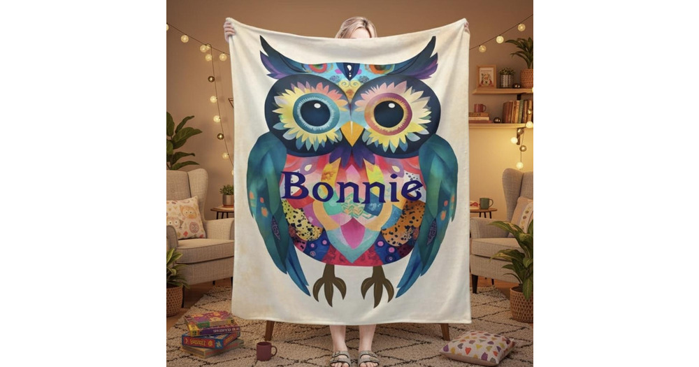 Personalized Owl Blanket: Romantic Flannel Fleece Throw, Custom Name Gift Colourful Bird