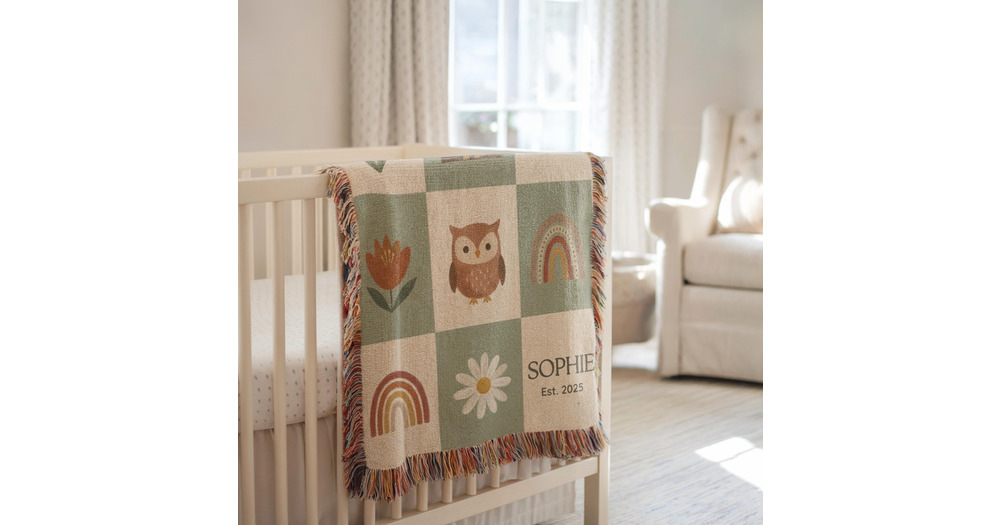 Personalized Baby Blanket, Woodland Owl Boho Nursery Throw, Custom Name Baby Decor, Newborn Gift, Ba