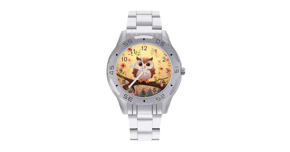 RLDOBOFE Men’s Business Steel Band Watch, Stainless Steel Quartz Cute Owl Printed Watch with S