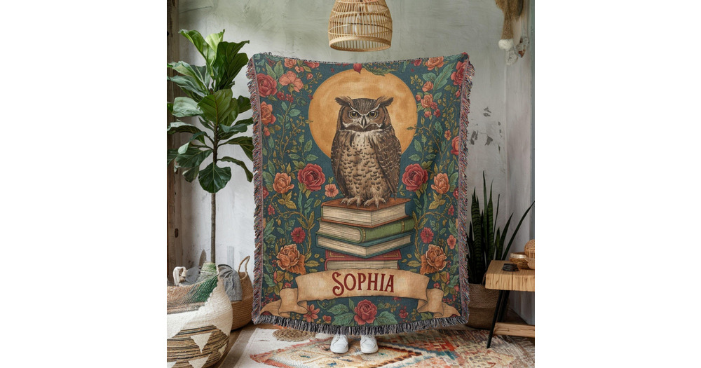 Personalized Owl Tapestry Blanket for Book Lover, Wisdom Owl Throw, Vintage Floral Dark Academia Wo