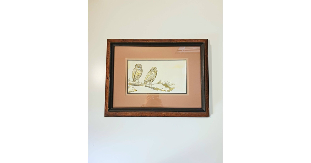 Original RE Thompson Owl Art Work - Vintage Pen & Watercolor Framed Bird Illustration - Signed b