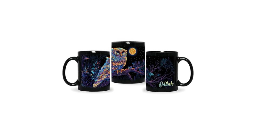 Colorful Owl On Branch Full Wrap Cup, Customized Name Night Sky Ceramic Mug, Custom Bird Lovers Coff