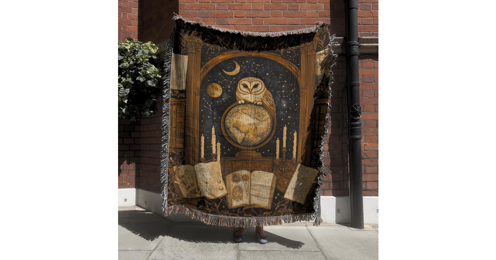 Mystical Owl & Globe Tapestry, HP Inspired Wall Hanging, Celestial Folk Style Woven Blanket, Vin