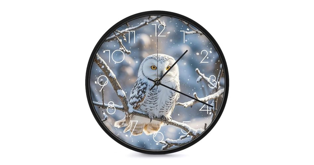 FekiLoot Winter White Owl Wall Clock 10 Inch Silent Non Ticking Battery Operated Round Wall Clock Mo