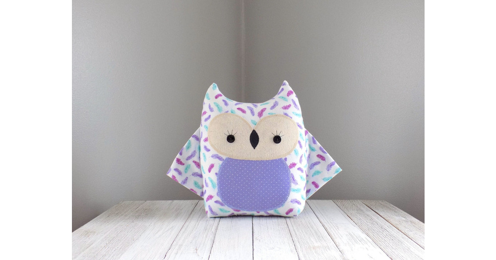 Owl stuffed animal in purple and teal feather print, woodland nursery baby shower gift, handmade hei