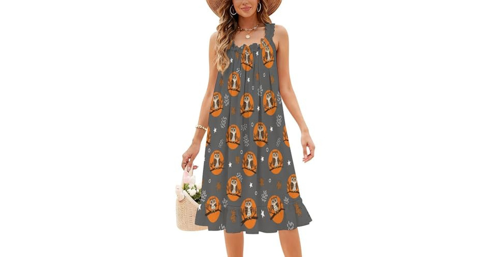 GemGam Womens Summer Sleeveless Dresses Owl Orange Circle Gray Ruffles Collar Midi Sundresses for Be
