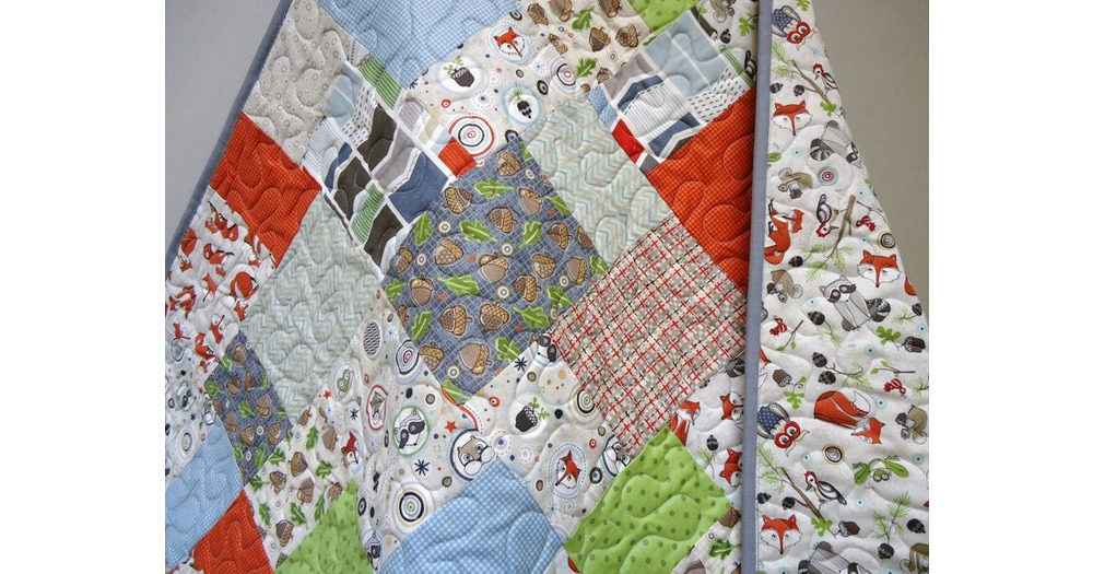 Modern Woodland Baby Boy Quilt, Fox Owl Raccoon Crib Bedding