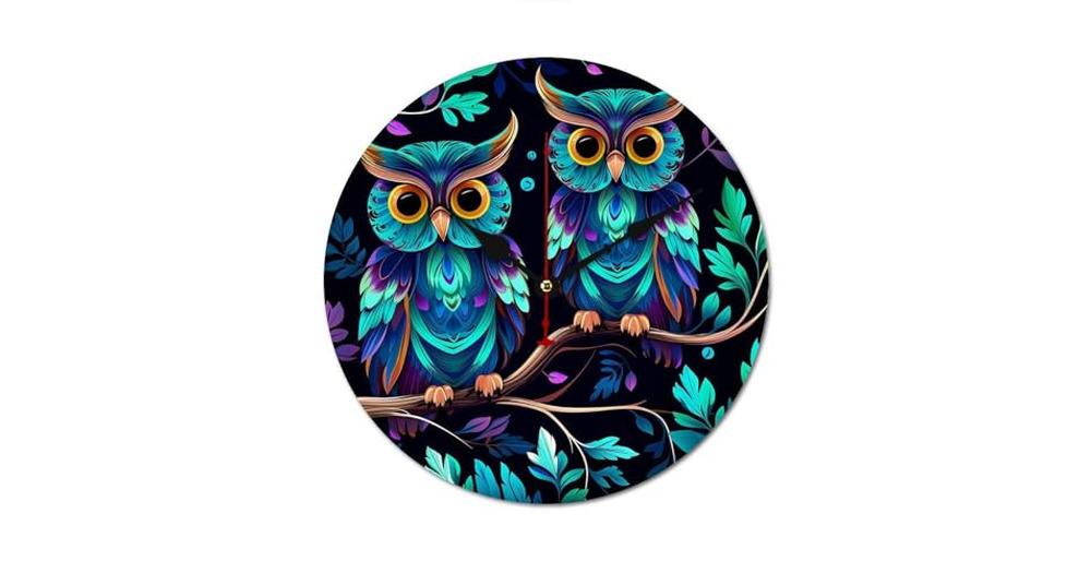 MNVTSKOP 15.7 Inches Decorative Wooden Modern Wall Clock Purple and Green Owl Printed Non Ticking Cl