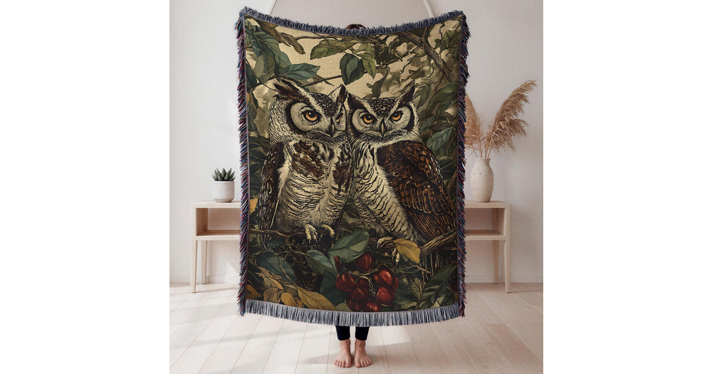 Vintage Owl Woven Blanket Rustic Owls Cozy Cabin Cotton Blanket Boho Botanical Wildlife Gift Wildern