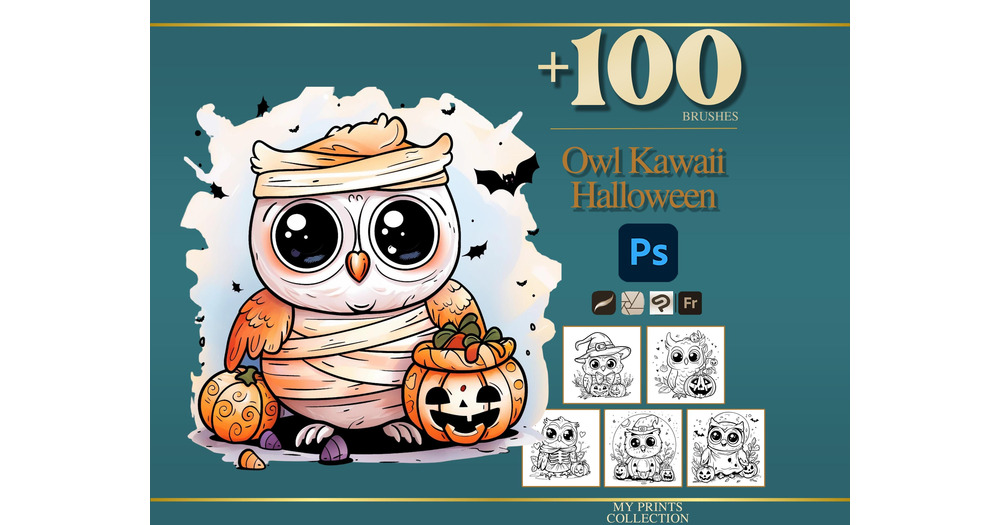 Owl Kawaii Halloween Photoshop Brushes & Procreate Stamps – 100+ Tattoo, Digital Art, Clip