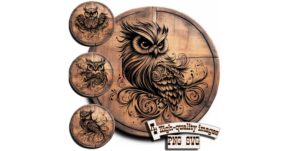 Bundle 4 Owl vector for design on wood, t-shirts, slate, canvas, mugs, laser engraving. PNG/SVG Сut