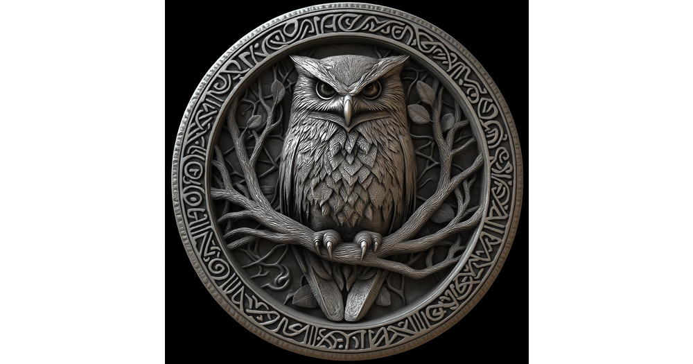 Norse Owl Coin Design: 3D Embossing, Laser Engraving (PNG)