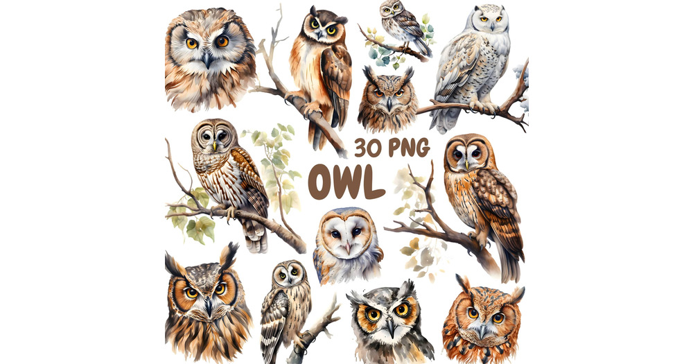 Watercolor Owl Clipart Bundle, Forest Birds Clipart, Woodland Illustrations, Transparent PNG Graphic