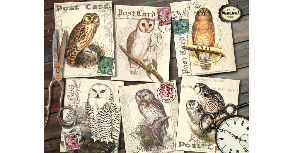 Vintage Owl Postcards: Shabby Collage, Junk Journal Cards (Digital Download)
