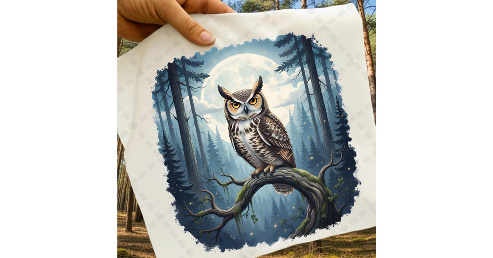 Horned Owl PNG on Moonlit Branch - Mystical Forest Wildlife Digital Art for Sublimation Crafts