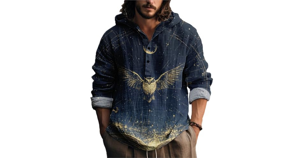 MARSVOVO Mens Shirt Hippie Starry Sky Owl Long Sleeve Lightweight Hoodie Fashion Casual Quarter Butt