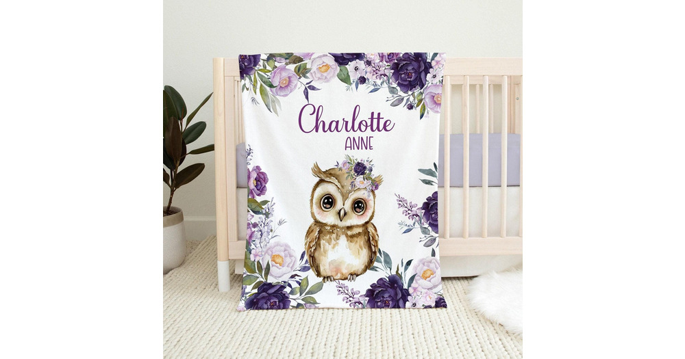 CUSTOM OWL BABY Blanket, Personalized Baby Name Blanket, Baby Girl Custom Blanket, Purple Floral Owl