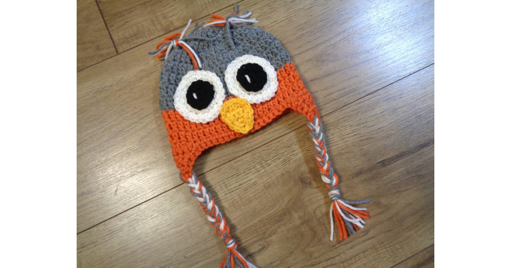 Crochet Owl Hat: Gray and Rust Fall or Winter Cap, All Sizes