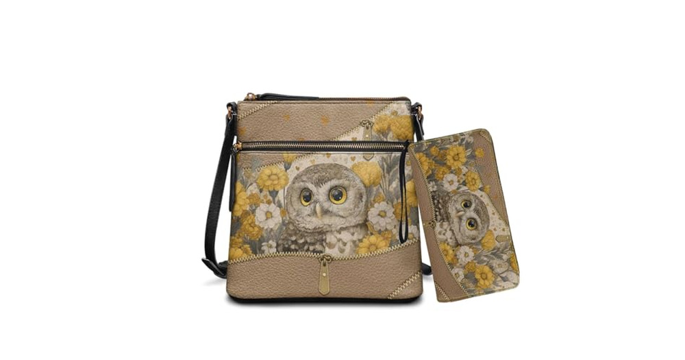 Sktodyaw Cute Owl Flower Zipper Print Crossbody Bag and Wallet Set for Women Leather Shoulder Bag wi
