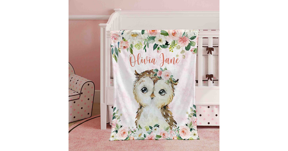 Pink Floral Owl Nursery Blanket, Personalized Baby Owl Blanket, Rose Flowers Girl Room Decor, Kids C