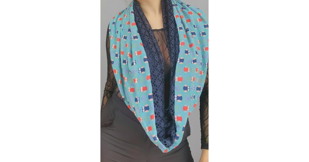 Luxury Handmade Infinity Scarf with Owl Print, Chiffon & Navy Lace, One of a Kind Designer Scarf