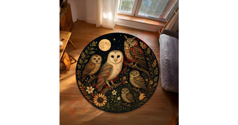 Owl Moon Round Rug, Mystical Forest Animal Design, Non-Slip Accent Carpet