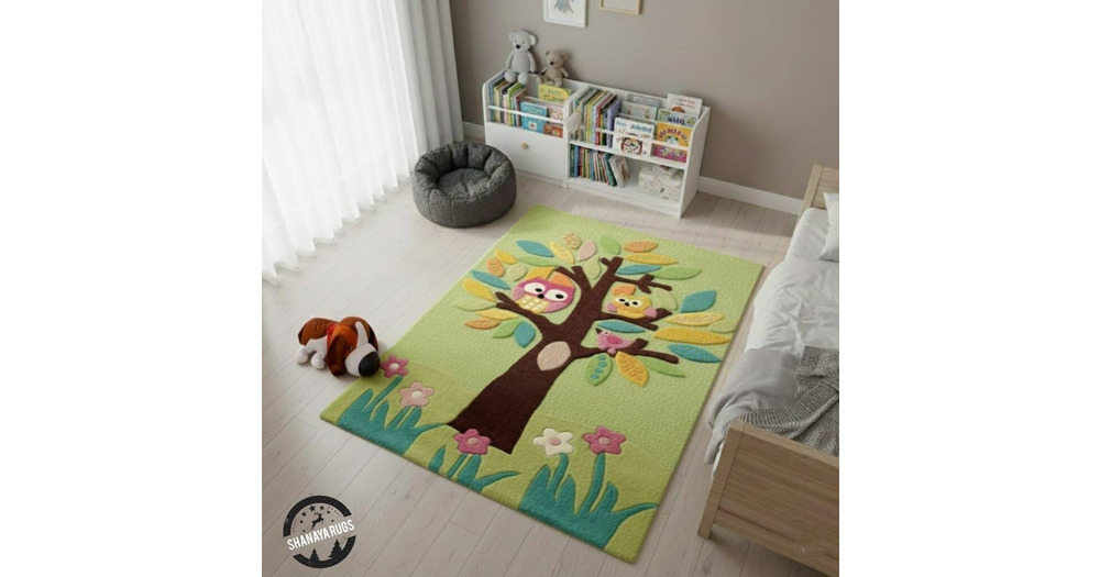 Hand Tufted loop & cut  Owl Tree Rug for Kids Room | 3D Nursery Area Rug Playroom Decor